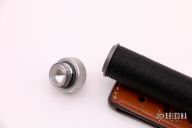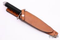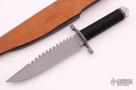 This Mini Sly II by Jimmy Lile features a bead blasted blade with sharpened top edge and sawteeth on the spine, .189" blade stock and 1.171" blade depth, hollow handle construction. The handle has a bead blasted stainless steel guard and grip with a knurled aluminum removable butt cap, black cord wrap. Comes with brown leather sheath. Excellent condition.
