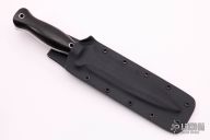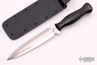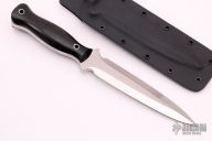 Maker statement: "The Shiva is a beautiful, bilaterally symmetrical double-edged dagger. Ostensibly designed for the same mission parameters as the legendary Fairbairn -Sykes Commando Knife, it has a number of significant design improvements which broaden its functional scope considerably. Most notable perhaps, is the handle, which flares out from a gentle lemon-drop to a knob-like pommel, which greatly facilitates a firm grip, and almost eliminates the problem of rolling in the palm. The geometry of the double hollow ground edges make them both striking in appearance and singularly functional. The Shiva gives you the best attributes of a stabbing pike and a straight razor." Black canvas micarta handle with hollow steel pins. Blade is .250" thick and 1.220" deep with full tang construction. Has a hand rub satin finished double-edged blade. Comes with a kydex sheath. Excellent condition.
