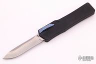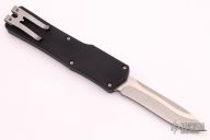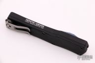 This Cleric OTF by Heretic Knives features a stonewashed recurve blade. The handle has a black aluminum frame with a stepped and anodized titanium thumbslide and bead blasted stainless steel tip down clip. Originally from the 2018 Blade Show. Includes the original box.  Excellent Condition.