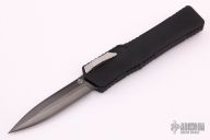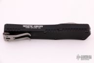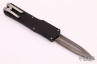 This Cleric OTF by Heretic Knives features a DLC dagger style  blade. The handle has a black tumbled aluminum frame with a stepped and bead blasted stainless steel thumbslide and tumbled stainless steel tip down clip. S/N 01430. Excellent condition. Comes with original box and papers.