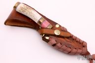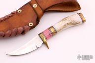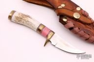 This small skinner by Ken Richardson features an upswept blade with jeweled flats and satin grinds, .087" blade stock and .953" blade depth, hidden tang construction. The handle has a brass guard and butt, stag grip, brass and pink turquoise large spacers with red/white/black spacers. Comes with a hand tooled brown leather sheath. Has some light scratches, otherwise excellent condition.