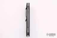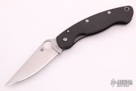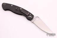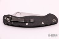 This Military Liner Lock by Spyderco has a satin finished clip point blade with notched thumb rest and thumbhole. Handle is black carbon fiber, with stainless steel single liner (lock), black stainless steel tip down clip, and lanyard tube pin. Includes the original box and papers.  Excellent Condition.