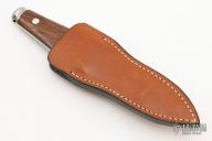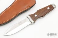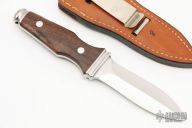 This is a very attractive boot knife from AG Russell. This is the older model made in Solingen, Germany. Blade is mirror polished with .155" thick and 1.100" deep at the ricasso, Cocobolo scales. Integral construction with aluminum pins. Comes with brown leather sheath with clip. Has some light scratches, otherwise excellent condition.