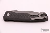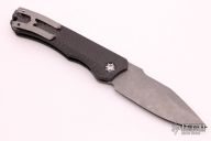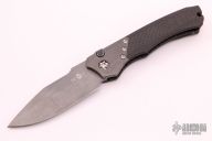 This Wraith Auto by Heretic Knives features a battleworn drop point blade with false top edge and notched thumbrest. The handle has a battleworn titanium bolster, integral carbon fiber handle with a tip up stainless steel clip, lanyard hole at the butt. Comes with original box and draw string bag. S/N000245. Excellent condition.