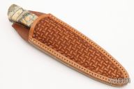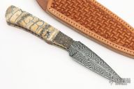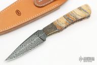 This knife by Kevin Casey features a Feather Damascus blade with (Damascus made by Kevin Casey), .157" blade stock and 1.150" blade depth, full tang construction. The handle has textured silicon bronze bolsters, mammoth tooth scales with bronze pins. Comes with a hand tooled brown leather sheath by Parsons and a nylon zippered case. Excellent condition.