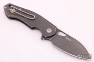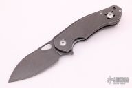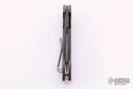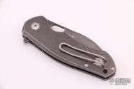 This AICE BIBLIO by Giant Mouse features a dark stonewashed drop point blade with thumbhole and notched thumb rest. The handle has a tumbled titanium frame with a stainless tip up pocket clip. Includes original box. Excellent Condition.