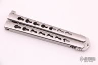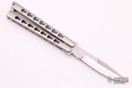 This balisong by 29 Knives features a satin finished blade with swedge. The handle is composed of satin finished integral stainless steel. Excellent work. Has some light scratches, otherwise the knife is in excellent condition. Comes with a zippered case