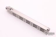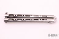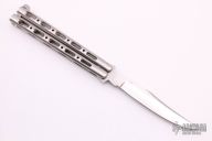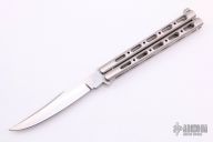 This balisong by 29 Knives features a satin finished "High Hollow" Bowie style blade with satin finished integral stainless steel handles with t-latch. The latch has been polished to reduce sharp edges and make it more pocket friendly. Excellent work. The blade has some scratches from opening and closing on the handle and blade otherwise the knife is in good condition. Comes with zippered case.