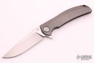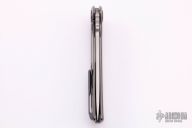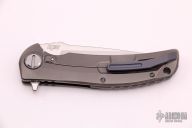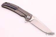 This Russian Overkill by Shirogorov and RJ Martin features a M398 blade with notched thumbrest and a flipper. The handle has a blasted and milled titanium frame, darkened titanium pivot collars, backspacer and tip up clip with hidden screws. Has RBS, nice detent, lockup and blade seating. Comes with original box and papers. Excellent condition. #028/200