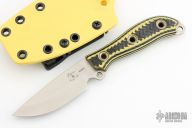 This Max Duty by Busse Custom Shop features a drop point satin finished ELMAX blade, .094" blade stock and 1.063" blade depth, full tang construction. The handle has yellow/black G-10 scales with hollow tube pins and lanyard hole. Comes with a kydex sheath w/ large TekLok by BuyBrown. Excellent condition.