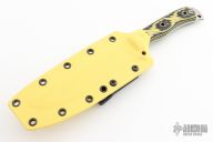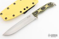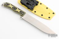 This Boss Jack by Busse features a satin finished drop point blade with no choil, .177" blade stock and 1.303" blade depth, full tang construction. The handle has black/yellow G-10 scales. Excellent condition. Comes with custom kydex sheath with TekLok by BuyBrown.