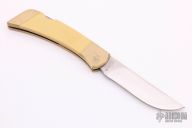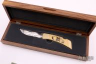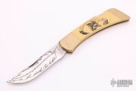 The Gerber Folding Sportsman III is constructed from a die cast brass frame. It measures 9 ¼” long when opened. The knife is 5” long when closed and weighs 9 ½ ounces. The blade is made of 440c stainless steel hardened to Rockwell 57-59C. The rivets are machined out of brass. The inlays are made of ivory micarta, a very durable yet beautiful knife material. It ages similar to ivory, yet doesn’t crack as ivory sometimes does. The precision-fit inlays are held in place by a LocTite product, eliminating unsightly rivets. The Bald Eagle Scene scrimshaw was done by a world renowned western/wildlife artist Jim Blair. His primary project was fossil ivory before joining Gerber Legendary knives. The blade of the knife is engraved with “1792-American Bald Eagle Bicentennial Commemorative-1982” Limited edition Collectible Knives only available through the American Bald Eagle Foundation. Each knife is numbered on the ivory paper micarta handle. This lockback folder features a polished blade with nail nick. The handle has integral brass bolsters and liners, ivory micarta scales, and stainless steel backspacer. Comes with a wooden display box. Great condition. The blade is etched "1782 - American Bald Eagle Bicentennial Commemorative - 1982". This knife is in the second run, numbers 201-2000. This one is #407. Excellent condition. Comes with original box.