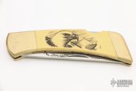 The Gerber Folding Sportsman III is constructed from a die cast brass frame. It measures 9 ¼” long when opened. The knife is 5” long when closed and weighs 9 ½ ounces. The blade is made of 440c stainless steel hardened to Rockwell 57-59C. The rivets are machined out of brass. The inlays are made of ivory micarta, a very durable yet beautiful knife material. It ages similar to ivory, yet doesn’t crack as ivory sometimes does. The precision-fit inlays are held in place by a LocTite product, eliminating unsightly rivets. The Bald Eagle Scene scrimshaw was done by a world renowned western/wildlife artist Jim Blair. His primary project was fossil ivory before joining Gerber Legendary knives. The blade of the knife is engraved with “1792-American Bald Eagle Bicentennial Commemorative-1982” Limited edition Collectible Knives only available through the American Bald Eagle Foundation. Each knife is numbered on the ivory paper micarta handle. This lockback folder features a polished blade with nail nick. The handle has integral brass bolsters and liners, ivory micarta scales, and stainless steel backspacer. Comes with a wooden display box. Great condition. The blade is etched "1782 - American Bald Eagle Bicentennial Commemorative - 1982". This knife is in the second run, numbers 201-2000. This one is #462. Excellent condition. Comes with original box and is still in the plastic wrapping and has never been opened. The pictures are of SKU# 1028751 which came from the same consignor that sent in multiple of these that were all unopened.