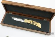 The Gerber Folding Sportsman III is constructed from a die cast brass frame. It measures 9 ¼” long when opened. The knife is 5” long when closed and weighs 9 ½ ounces. The blade is made of 440c stainless steel hardened to Rockwell 57-59C. The rivets are machined out of brass. The inlays are made of ivory micarta, a very durable yet beautiful knife material. It ages similar to ivory, yet doesn’t crack as ivory sometimes does. The precision-fit inlays are held in place by a LocTite product, eliminating unsightly rivets. The Bald Eagle Scene scrimshaw was done by a world renowned western/wildlife artist Jim Blair. His primary project was fossil ivory before joining Gerber Legendary knives. The blade of the knife is engraved with “1792-American Bald Eagle Bicentennial Commemorative-1982” Limited edition Collectible Knives only available through the American Bald Eagle Foundation. Each knife is numbered on the ivory paper micarta handle. This lockback folder features a polished blade with nail nick. The handle has integral brass bolsters and liners, ivory micarta scales, and stainless steel backspacer. Comes with a wooden display box. Great condition. The blade is etched "1782 - American Bald Eagle Bicentennial Commemorative - 1982". This knife is in the second run, numbers 201-2000. This one is #460. Excellent condition. Comes with original box and is still in the plastic wrapping and has never been opened. The pictures are of SKU# 1028751 which came from the same consignor that sent in multiple of these that were all unopened.