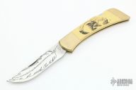 The Gerber Folding Sportsman III is constructed from a die cast brass frame. It measures 9 ¼” long when opened. The knife is 5” long when closed and weighs 9 ½ ounces. The blade is made of 440c stainless steel hardened to Rockwell 57-59C. The rivets are machined out of brass. The inlays are made of ivory micarta, a very durable yet beautiful knife material. It ages similar to ivory, yet doesn’t crack as ivory sometimes does. The precision-fit inlays are held in place by a LocTite product, eliminating unsightly rivets. The Bald Eagle Scene scrimshaw was done by a world renowned western/wildlife artist Jim Blair. His primary project was fossil ivory before joining Gerber Legendary knives. The blade of the knife is engraved with “1792-American Bald Eagle Bicentennial Commemorative-1982” Limited edition Collectible Knives only available through the American Bald Eagle Foundation. Each knife is numbered on the ivory paper micarta handle. This lockback folder features a polished blade with nail nick. The handle has integral brass bolsters and liners, ivory micarta scales, and stainless steel backspacer. Comes with a wooden display box. Great condition. The blade is etched "1782 - American Bald Eagle Bicentennial Commemorative - 1982". This knife is in the second run, numbers 201-2000. This one is #434. Excellent condition. Comes with original box and is still in the plastic wrapping and has never been opened. The pictures are of SKU# 1028751 which came from the same consignor that sent in multiple of these that were all unopened.