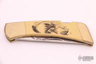 The Gerber Folding Sportsman III is constructed from a die cast brass frame. It measures 9 ¼” long when opened. The knife is 5” long when closed and weighs 9 ½ ounces. The blade is made of 440c stainless steel hardened to Rockwell 57-59C. The rivets are machined out of brass. The inlays are made of ivory micarta, a very durable yet beautiful knife material. It ages similar to ivory, yet doesn’t crack as ivory sometimes does. The precision-fit inlays are held in place by a LocTite product, eliminating unsightly rivets. The Bald Eagle Scene scrimshaw was done by a world renowned western/wildlife artist Jim Blair. His primary project was fossil ivory before joining Gerber Legendary knives. The blade of the knife is engraved with “1792-American Bald Eagle Bicentennial Commemorative-1982” Limited edition Collectible Knives only available through the American Bald Eagle Foundation. Each knife is numbered on the ivory paper micarta handle. This lockback folder features a polished blade with nail nick. The handle has integral brass bolsters and liners, ivory micarta scales, and stainless steel backspacer. Comes with a wooden display box. Great condition. The blade is etched "1782 - American Bald Eagle Bicentennial Commemorative - 1982". This knife is in the second run, numbers 201-2000. This one is #413. Excellent condition. Comes with original box and is still in the plastic wrapping and has never been opened. The pictures are of SKU# 1028751 which came from the same consignor that sent in multiple of these that were all unopened.