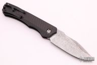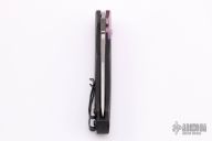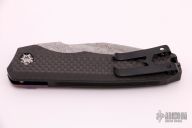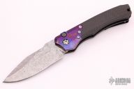 This Wraith Auto by Heretic Knives features a polished and blued VF Damascus clip point blade with false top edge and notched thumbrest. The handle has a Damtanium bolster with a polished flat and orange peel finished bevels, integral carbon fiber handle with a black tip up stainless steel clip, lanyard hole at the butt, satin hardware.  Excellent Condition.