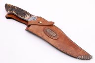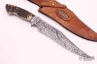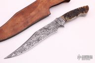 This Integral Warrior by Smid Damascus features a Damascus blade with false top edge, integral guard and full tapered tang, .206" blade stock and 1.771" blade depth. The handle has big horn sheep scales with brass lanyard hole. Comes with a brown leather sheath with sheep horn inlay. Comes with COA. New from maker.