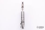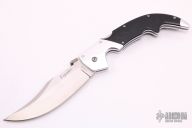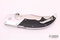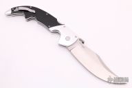 Like the swords of old the Espada’s are not for the weak, timid, faint of heart or those desiring another spring assisted play toy. Just pick one up and you’ll see what we mean! Definitely not politically correct, they are huge yet surprisingly well balanced and feature dramatically upswept clip point blades that are ideal for cutting, slashing and piercing. Made from vacuum heat-treated and sub-zero quenched Japanese 8A stainless steel and hollow ground to a thin, razor sharp edge, they will cleave through just about any obstacle or target in their path. To make your hand the real master of these awesome blades we have paired them with state of the art pistol grip handles. Strongly curved and equipped with multiple finger grooves and even a sub-hilt in the two larger models, they work perfectly in either a forward or reverse grip while offering unprecedented retention and reach through multiple grip extension options. To minimize overall weight and maximize strength and rigidity, we have CNC machined the frames and integral bolsters of the Espada’s handles from 7075 Aluminum billets. While quite costly, this material rivals even Titanium in strength and can endure years of the hardest abuse. Finally to make the handle as beautiful as it is effective and strong, we have mirror polished the dovetailed bolsters and attached glossy black G-10 handle scales using the latest high tech fasteners. We don’t believe any tactical folder can make a credible claim to being a “pocket sword” without possessing an incredibly strong and reliable lock and the Espada’s are no exception. That’s why we have equipped each model with our new multi-patented TRI-AD lock. Designed by Andrew Demko, the TRI-AD is unsurpassed in resisting positive pressure from the edge (cutting, slashing and chopping), negative pressure from the point (piercing, digging and chiseling), and impact pressure (whacks on the back of the spine of the blade) by diverting these forces first to its unique stop pin and then throughout the entire handle frame. At first thought, carrying a “pocket sword” as big and heavy as the Espada may seem impractical. However, after much experimentation, we have found this is not the case. Even the biggest model can be carried discreetly and unobtrusively in the front pocket of most pants and when clipped to the waistband and covered by a “bloused” shirt or sweater they totally disappear. Then in an emergency they can be drawn and opened in a single motion by snagging the patented thumb plate on the edge of a pocket." Blade Steel: Japanese 8A stainless steel