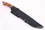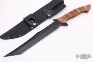 This Large Fighter by Barry Dawson features a black tanto blade with false top edge and notched thumbrest, .249" blade stock and 1.697" blade depth, full tang construction. The handle has natural canvas micarta scales. Comes with a kydex sheath. Excellent condition.