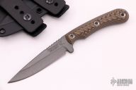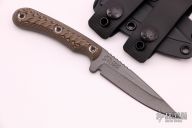 The sparrow is a compact bird and trout style fixed blade that excels in a concealed carry or everyday carry role for your go-to knife needs. It’s a knife that you can pull out in the park to cut your apple without anyone being concerned that you have a knife. It blends in well in both urban and rural settings and is a great companion for any adventure. The classic drop point blade has a tungsten Cerakote finish for corrosion and glare resistance. The beveled and contoured G10 grips features diagonal texturing for a not too aggressive but secure grip. Comes with molded kydex scabbard with pull the dot snap loops ready for horizontal and vertical carry. Excellent condition. Comes with original box and COA dated 2020.