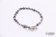 This Bracelet by Starlingear is made of .925 Sterling Silver. It has a slickster skull and cross link construction. Comes with drawstring bag. Has some light scratches, excellent condition otherwise.