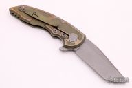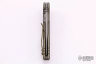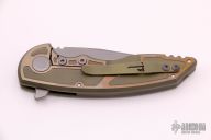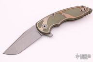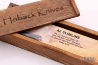 From Hoback Knives: The A8 is the down-home, hard-work inspired folder. We built this knife to be at home in your pocket, so it’s always where you need it and you don't have to think about it. It just plain works. We took the A10 folder and scaled it down to be much more pocket-friendly, while still being large and in charge! The A8 still sports a 3.25” long blade like its A10 big brother, but it’s much narrower and slides into the pocket with ease. And anytime you see the word “Slimline,” you know the knife will be lighter, faster, and thinner for even more ease of carrying. It will boast the same strength and precision engineering you have come to expect from Jake Hoback Knives. SPECIFICATIONS: Blade: CPM-20CV, 3.25 Length, .1875 Thickness, bronze anodized finish Frame: Grade 38 Titanium, .1875 Thickness, Stonewash blade finish. Closed Length: 4.66" Open Length: 7.796" Weight: 4.7oz. Other Features: Pivot Thrust Bearings HRD (Hoback Roller Detent) Engineered Internal Lightening Pockets (less weight, same strength) Standard Sizes on all Screws for Ease of Replacement Hardened Steel Bearing Races. Comes in the original wooden box. Has some light scratches, otherwise excellent condition.