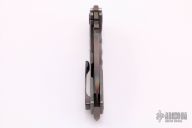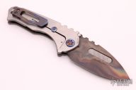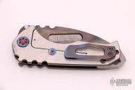 This Praetorian Genesis T by Medford Knife and Tool features a Vulcan finished drop point blade with pattern laser engraved fullers and notched thumbrest. The handle is comprised of faced silver titanium over a D2 backspacer/glass breaker with lanyard bail. The anodized titanium tip up clip is positioned for right hand carry. Includes vault style case, original box and papers. Excellent condition.