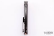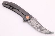 This Mini Persian flipper by Walter Randolph features a Chad Nichols Intrepid Damascus blade with notched thumbrest and flipper. The handle has a bead blasted titanium frame with bog oak inlay, copper pivot with zirconium pivot collars, floating copper backspacer and a zirconium tip up clip. Rides on bearings, nice detent, lockup and blade seating. Comes with cloth pouch and COA dated 5-28-2021. New from maker at TKI 2021.
