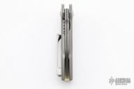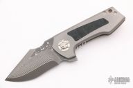 This Micro Boson Flipper by Michael Burch features an SG2 San Mai Damascus blade with notched thumbrest and flipper. The handle has a bead blasted titanium frame with tip up orange peel finished titanium clip with hidden screws, Westinghouse Ivory Paper Micarta inlaid pivot, Westinghouse Ivory Paper Micarta pivot collars and backspacer, has lanyard hole. Rides on bearings, nice detent, lockup and blade seating. Comes with a velcro case and COA dated 2021 TKI