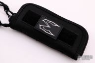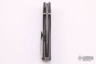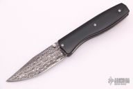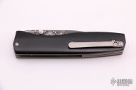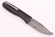 This Karma Linerlock by Merriken Knives features a Chad Nichols Intrepid Damascus with dual thumbstuds. The handle has black paper micarta scales, bead blasted titanium liners, tip up orange peel finished titanium clip, orange peel finished titanium backspacer with blasted brass spacers. Nice detent, lockup and blade seating, rides on bearings. Comes with zippered case and COA dated 5/29/21. New from maker at the 2021 Nashville Custom Knife Show.