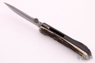 This ATCF by Bob Terzuola features a Chad Nichols "Galactic Bacon" Damascus blade with false top edge, notched thumbrest and a thumbdisc. The handle has a black titanium frame and tip up clip with hidden screws, Bob Loveless stag scale, zirconium pivot collar, carbon fiber backspacer. Nice detent, lockup and blade seating, rides on bearings. Comes with a zippered case and COA. New from maker at TKI 2021. Comes with a letter from Bob Terzuola verifying that the stag came from Bob Loveless's collection.