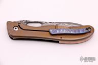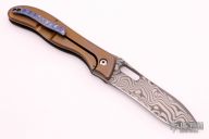 This 3.5" Notorious by Gerry McGinnis features a 3V/XHP Damascus recurve blade with notched thumbrest and thumbhole. The handle has a carbon fiber and anodized titanium frame with green canvas micarta inlay, copper backspacer, tip up MokuTi clip. Comes with a leather zippered case and COA dated 5-26-2021. Nice action, detent, lockup, and blade seating. New from maker at TKI 2021.