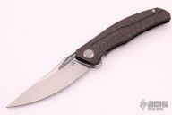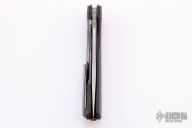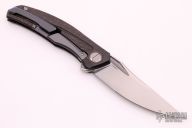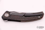This Quantum by Shirogorov features a tumbled blade with notched thumbrest and flipper. The handle has a milled bronze carbon fiber frame, bronze backspacer, tip up anodized titanium clip with hidden screws. Rides on RBS, nice detent, lockup and blade seating. Comes with original box and COA dated 2021. New from maker at the 2021 Nashville Custom Knife Show.