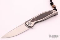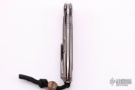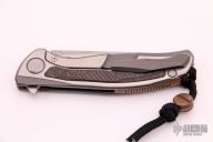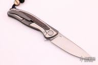 This F95R NL framelock flipper from Shirogorov has a flat ground tumble finished blade with notched thumbrest and flipper. The handle nas a tumbled and milled titanium frame with bronze carbon fiber inlays, bronze backspacer and titanium bead, tip up titanium clip with hidden screws. Excellent lockup, crisp detent, and perfect seating. MRBS.Knife comes in original box and COA. New from maker at the 2021 TKI Show. This knife is the TKI 2021 Nashville Show Special.