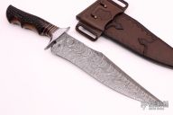 Another absolutely stunning piece from the Sobral brothers! This Fighter features a Wavy Ladder Pattern Damascus blade with false top edge, .223" blade stock and 2.385" blade depth, hidden tang construction. The handle has a Aisi 420 stainless steel guard and a beautiful stag grip with nickel silver and canvas micarta spacers. This piece comes in an equally impressive, hand tooled, brown leather sheath and a leather zippered case. New from maker.