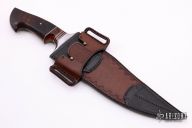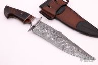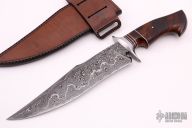 Another absolutely stunning piece from the Sobral brothers! This Fighter features a Wavy Ladder Pattern Damascus blade with false top edge, .287" blade stock and 2.188" blade depth, hidden tang construction. The handle has a Aisi 420 stainless steel guard and a beautiful desert ironwood burl grip with nickel silver and canvas micarta spacers. This piece comes in an equally impressive, hand tooled black/brown leather sheath and a leather zippered case. New from maker.