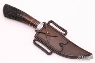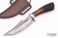 Another absolutely stunning piece from the Sobral brothers! This Rhino features a San Mai Damascus blade with false top edge and fullers, .222" blade stock and 1.525" blade depth, hidden tang construction. The handle has a Aisi 420 stainless steel guard and a beautiful stag grip with nickel silver and canvas micarta spacers. This piece comes in an equally impressive, hand tooled, brown leather sheath and a leather zippered case. New from maker.
