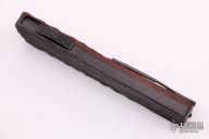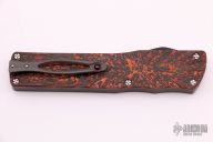 This Twist Tighe OTF by Brian Tighe features a hand rub satin finished double-edged dagger blade. The handle has a milled and DLC coated titanium front, fat carbon back, tip up titanium clip with ruby ball insert, has ruby ball insert in the butt as a glass breaker, has a carbon fiber thumb slide. Comes with a zippered case. New from maker.