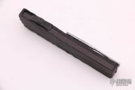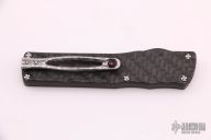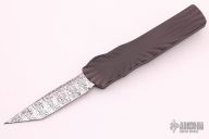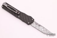 This Small Twist Tighe OTF by Brian Tighe features a Damasteel tanto blade. The handle has a milled and DLC coated titanium front, carbon fiber back, tip down Damasteel clip with ruby ball insert, has ruby ball insert in the butt as a glass breaker, has a carbon fiber thumb slide. Comes with a zippered case. New from maker.