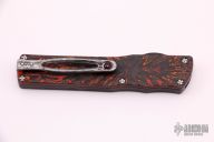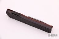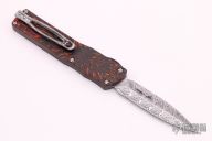 This Small Twist Tighe OTF by Brian Tighe features a Damasteel double edged blade. The handle has a milled and DLC coated titanium front, fat carbon back, tip down Damasteel clip with ruby ball insert, has ruby ball insert in the butt as a glass breaker, has a carbon fiber thumb slide. Comes with a zippered case. New from maker.