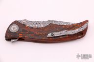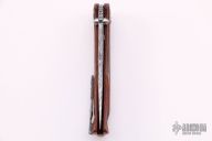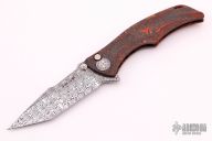 This Tighe Down Button Lock Flipper by Brian Tighe features a Damasteel multi-ground tanto blade with notched thumbrest, flipper and dual thumbstuds. The handle has an integral black/red fat carbon frame with a tip up Damasteel clip with ceramic ball inlay and pivot collars. Comes with a zippered case. New from maker.