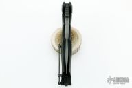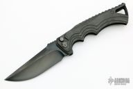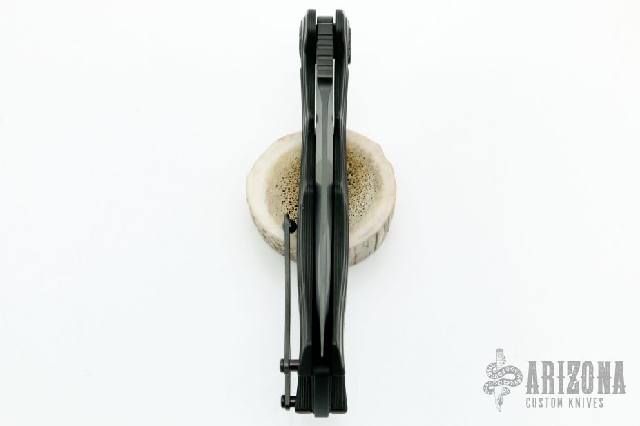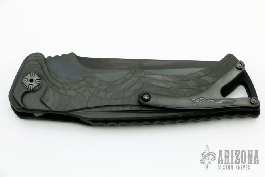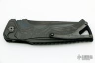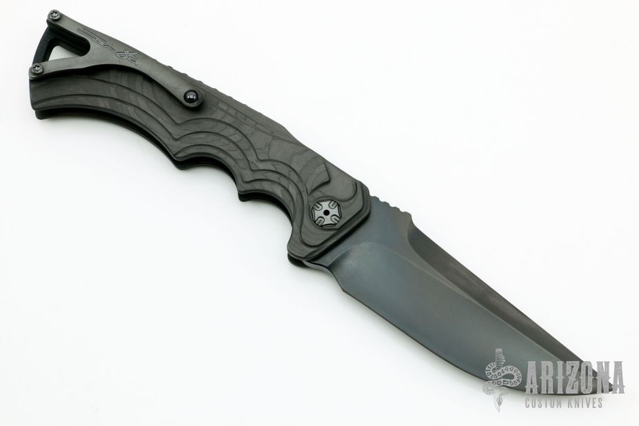 This Tighe Fighter from Brian Tighe features a DLC blade with swedge, dual thumb studs, notched thumbrest and flipper. The handle is comprised of a carbon fiber scales, over a notched black G-10 backspacer, DLC titanium tip up pocket clip with ceramic ball inset. Has a milled pivot screw. Comes with nylon zippered case. New from maker.