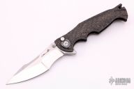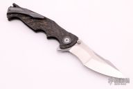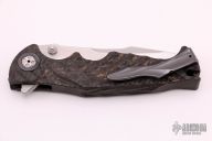 This Tighe Breaker Integral Flipper by Brian Tighe features a hand rub satin finished blade with dual thumb studs, notched thumbrest and a flipper. The handle has a milled, integral bronze carbon fiber frame with deep finger grooves, Zirconium pivot collars and tip up clip, lanyard hole at the butt. Smooth flipper action. Nice blade seating and lockup. Excellent work. Comes with a nylon zippered case. New from maker.
