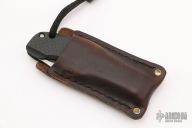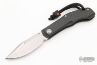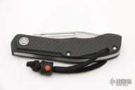 This Slipjoint by JB Stout features a tumbled blade with fullers. The handle has carbon fiber covers, and a tumbled steel spring, lanyard hole with custom carbon fiber bead with orange G-10 inlay. Includes a brown leather slip sheath. Excellent Condition.