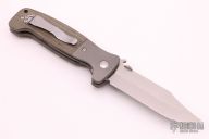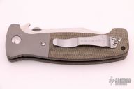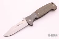 This is the CQC-12 Comrade, this design was based on Ernie's study of the AK-47 Bayonet. This is the same Model that Ernie himself carries. A true classic and a very rare opportunity for the serious Emerson collector. Satin finished clip point blade with thumbdisc and wave feature. The handle has bead blasted dovetailed titanium bolsters, green micarta scales, standoffs, bead blasted titanium liners and a tip up stainless steel clip. Nice lockup, detent and blade seating. Comes with original box. New from maker at the 2021 Blade Show.
