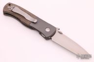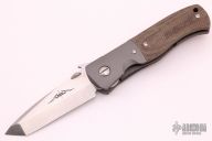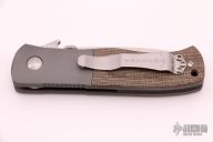 This Custom CQC-7 by Emerson Knives features a chisel ground satin finished tanto blade with notched thumbrest, wave feature and thumbdisc. The handle has bead blasted and dovetailed titanium bolsters, green canvas micarta scales, bead blasted titanium liners, black G-10 backspacer, tip up stainless steel clip. Comes with original box. New from maker at the 2021 Blade Show.