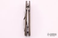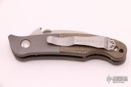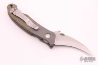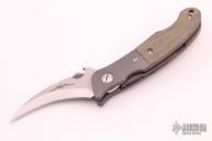 This Custom Elvia by Emerson Knives features a satin finished hawkbill blade with thumbdisc. The handle has bead blasted and dovetailed titanium liners, green canvas micarta scales, bead blasted titanium liners and a stainless steel tip up clip. Comes with original box. New from maker at the 2021 Blade Show.