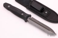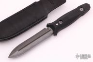This Dagger by Allen Elishewitz features a Stainless San Mai Damascus double-edged wasp blade with fullers, .175" blade stock and 1.100" blade depth, hidden tang construction. The handle is black G-10. Comes with a black leather sheath with stainless steel clip. Comes with COA. New from maker at the 2021 Blade Show.