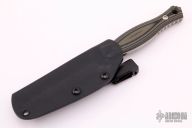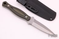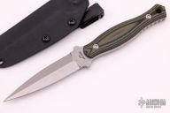 This Galvo Dagger by Les George features a stonewashed double-edged blade with .172" blade stock and .905" blade depth, full tang construction. The handle has black/green G-10 scales and a lanyard hole. Comes with a kydex sheath with Ulti-Clip. Comes with zippered case. New from maker at the 2021 Blade Show.